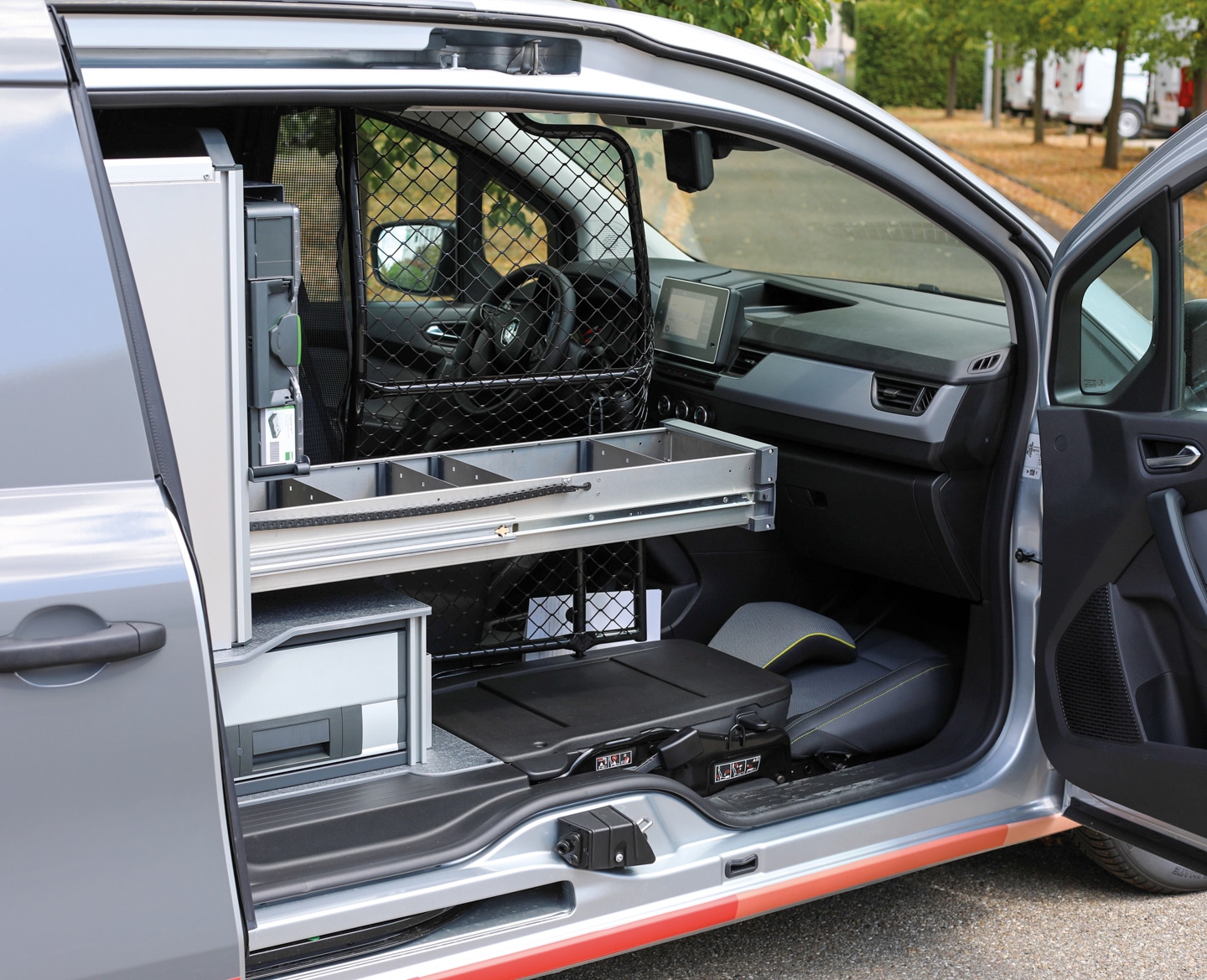Beim Renault Kangoo erweist sich die fehlende B-Säule auf der Beifahrerseite als Vorteil. Eine der Schubladen lässt sich gut zugänglich aus dem Laderaum über den umgeklappten Beifahrersitz in Fahrtrichtung ausziehen. Da der Inhalt dabei überdacht ist, sind empfindliche Bauteile vor Wettereinflüssen geschützt. Ein mit weiteren Schubladen versehenes Unterflurmodul sowie zwei Regalaufbauten machen das ganze Volumen des Laderaums organisiert nutzbar. Dennoch bleibt zwischen den Regalmodulen ausreichend Platz, um sperrige Gegenstände zu sichern. Der Renault Kangoo ist mit zahlreichen Behältern für Kleinteile, Innenraumbeleuchtung und einer herausziehbaren Werkbank mit Schraubstock ausgestattet.