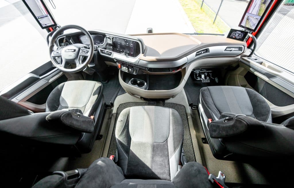 DAF kombiniert das größte Fahrerhaus am Markt mit der besten Effizienz und den höchsten Sicherheitsstandards. Deshalb sind die Modelle XF und XG die von Lkw-Fahrschulen präferierten Baureihen. Gerade der DAF XF ist das perfekte Fahrzeug für Fahrschulen, die in der Ausbildung nicht mehr als drei Sitzplätze benötigen. DAF XG und XG+ bieten sich an für Fahrschulen, die weite Wege zum Prüfungsort haben und/oder regelmäßig mit mehreren Fahrschülern unterwegs sind. Dank des großen Fahrerhauses lassen sich problemlos fünf Einzelsitze verbauen, wobei auch die Sitze in der zweiten Reihe über ein außerordentlich hohes Maß an Beinfreiheit und Komfort verfügen. Dazu kommt die enorme Stehhöhe, so beim XG+ von 2,17 m, die ein einfaches Ein- und Aussteigen, aber auch ein entspanntes Agieren von mehreren Personen ermöglicht. Hinter dem Mittelsitz gibt es zudem Platz für eine Kühlbox oder eine zusätzliche Ablagefläche. Der weit ausziehbare Tisch im Armaturenbrett erleichtert die Dokumentenbearbeitung durch den Fahrprüfer.
