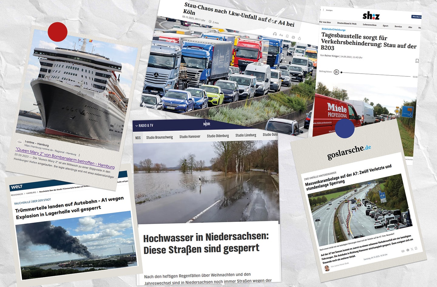 - wetterbedingte Ursachen (z.B. Fähr- bzw. Flugumleitungen wegen Sturmwarnungen, Drohnensichtungen, gesperrte Straßen nach Windbruch, o.ä.)